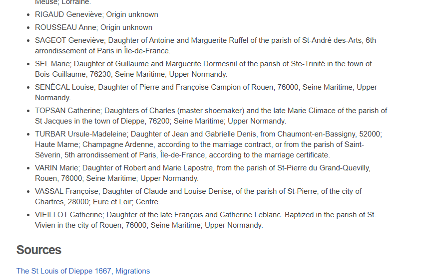 Gagné, Peter J. King's Daughters and Founding Mothers: The Filles du Roi, 1663-1673, Volume 2. Pawtucket, RI: Quintin Publications, 2001. ISBN: 1-55521-271-4