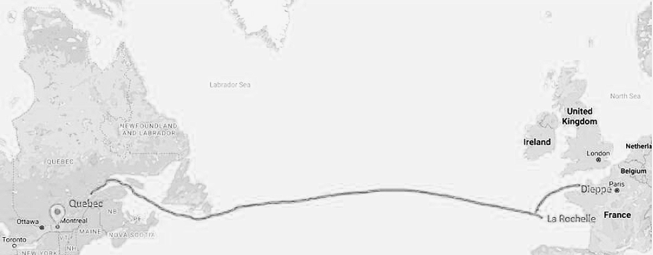 The route of the St. Louis de Dieppe, June-September 1667. Louise survived a 107-day crossing that claimed the lives of roughly 10% of passengers.