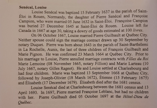 Louise Senécal was one of 768 Filles du Roi who immigrated to New France between 1663 and 1673. According to genealogist Peter J. Gagné, Louise left an estimated million descendants. Today, thousands of French Canadians descend from Louise Senécal through her son Joseph-Olivier Guilbault (1672-1738).
