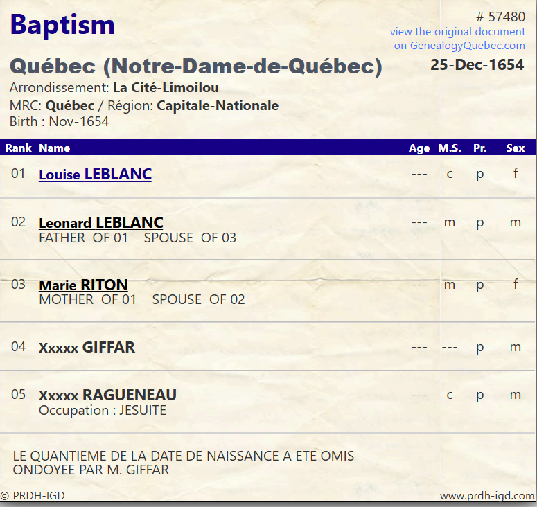 - GFNA (Genealogy of French in North America) — Denis Beauregard's database documenting the Leblanc-Riton family and mtDNA signatures.