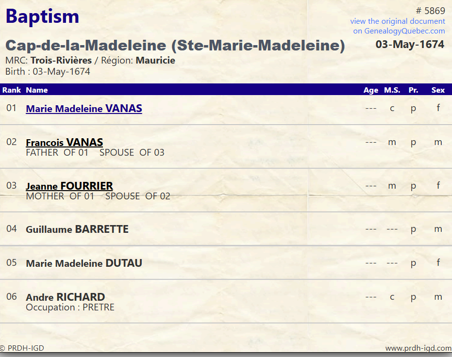 From this single Protestant girl who crossed the Atlantic in 1658, the PRDH database has traced: