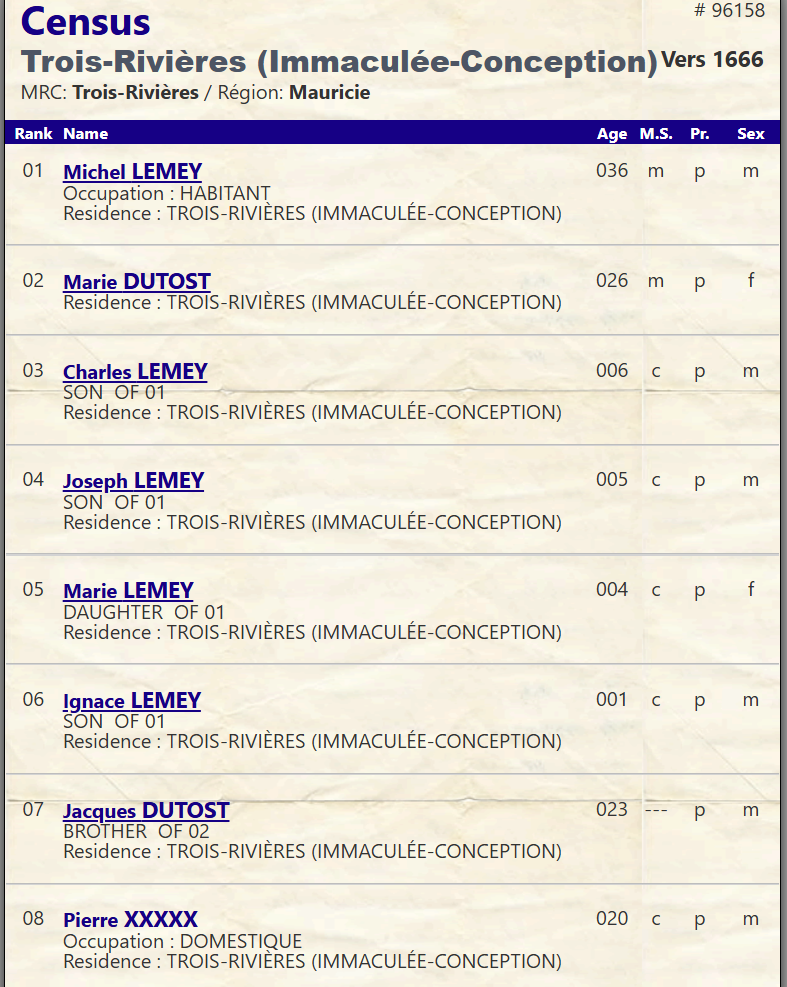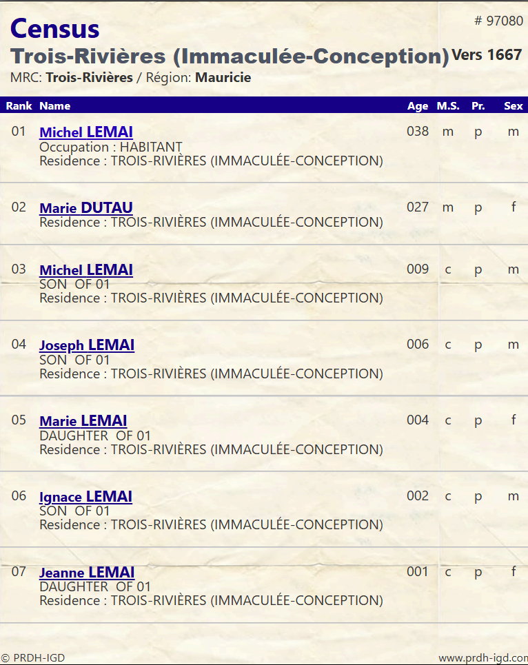 Their brother Charles also thrived. He married Jeanne Rivard on 22 April 1669 and settled at Champlain, where he lived until his death on 12 June 1717. The 1666 census shows him living with Marie and Michel's household—the siblings stayed close in those early years.