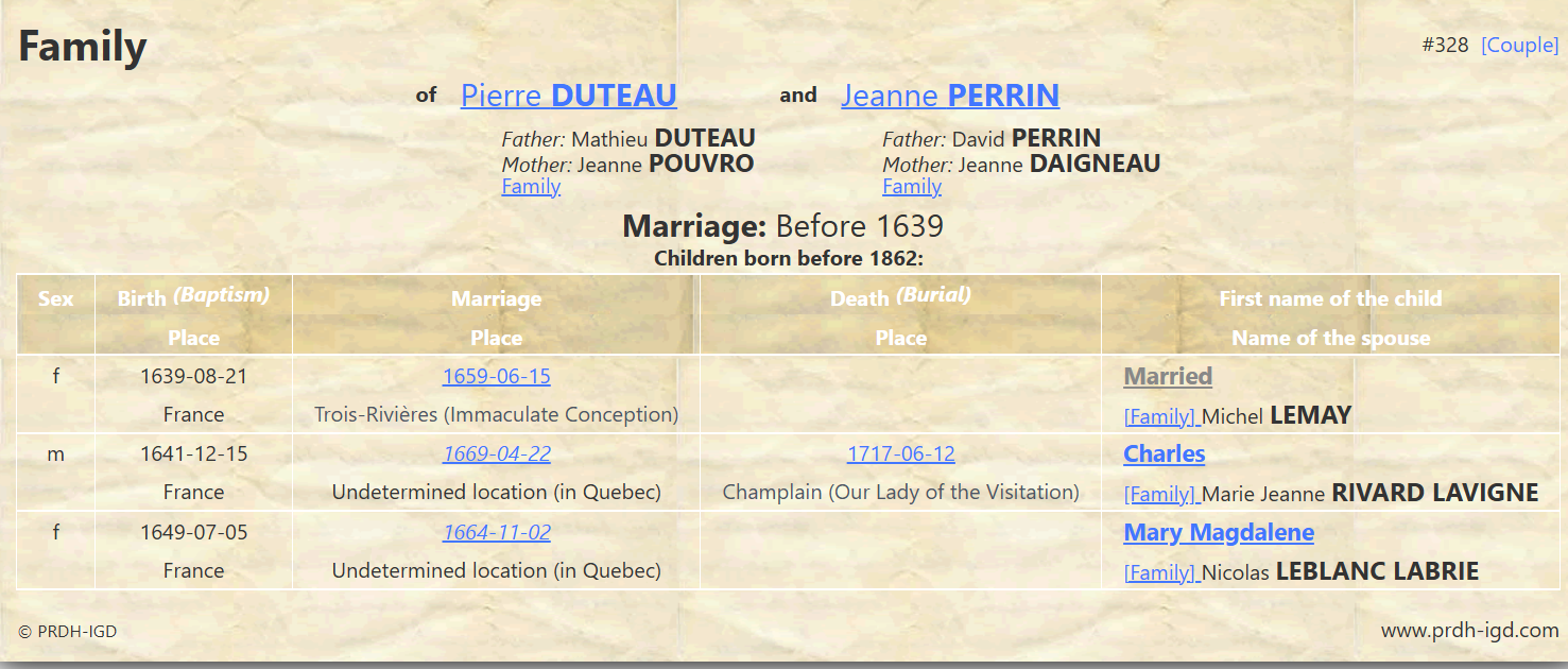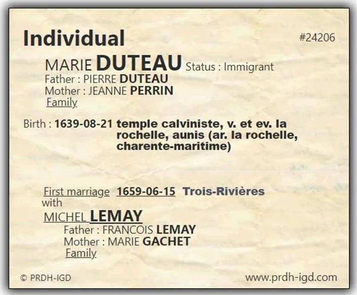 This makes the Duteau family remarkable: two of the approximately 262 Filles à marier came from the same Protestant household in La Rochelle.