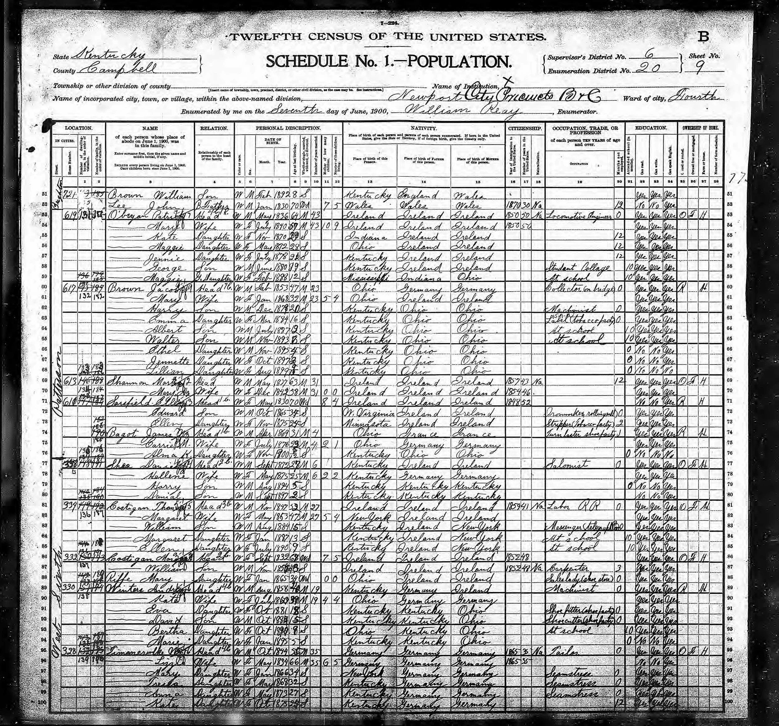 1900 Federal Census, Newport, Campbell County, Kentucky. Patrick O'Bryan (line 53), age 64, Locomotive Engineer, arrived 1850. Wife Mary, daughters Kate, Maggie, Jennie, and son George (at Student College).