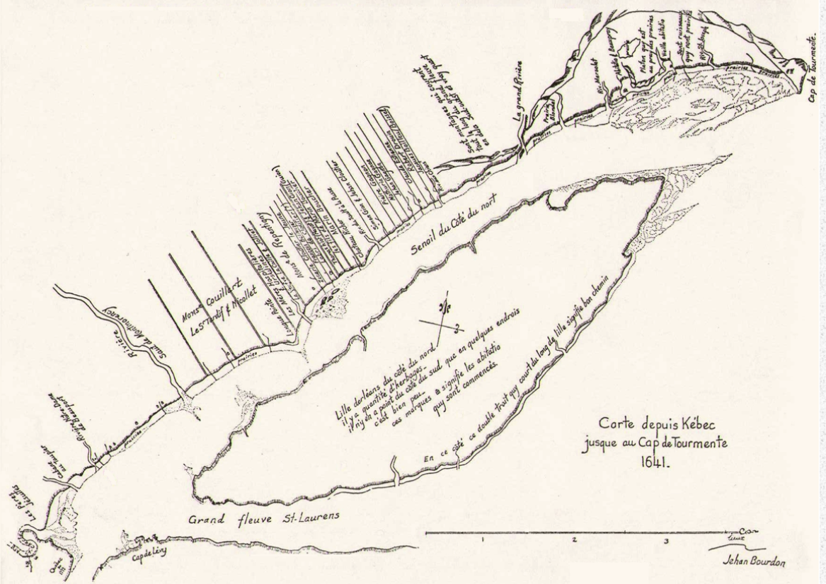 In 1641, the surveyor, Jean Bourdon, drew a map of the Beaupré Coast on which we can locate the land of Robert Drouin. It was situated between the properties of Jacques Boissel and Claude Estienne, to the west of Rivière-aux-Chiens.