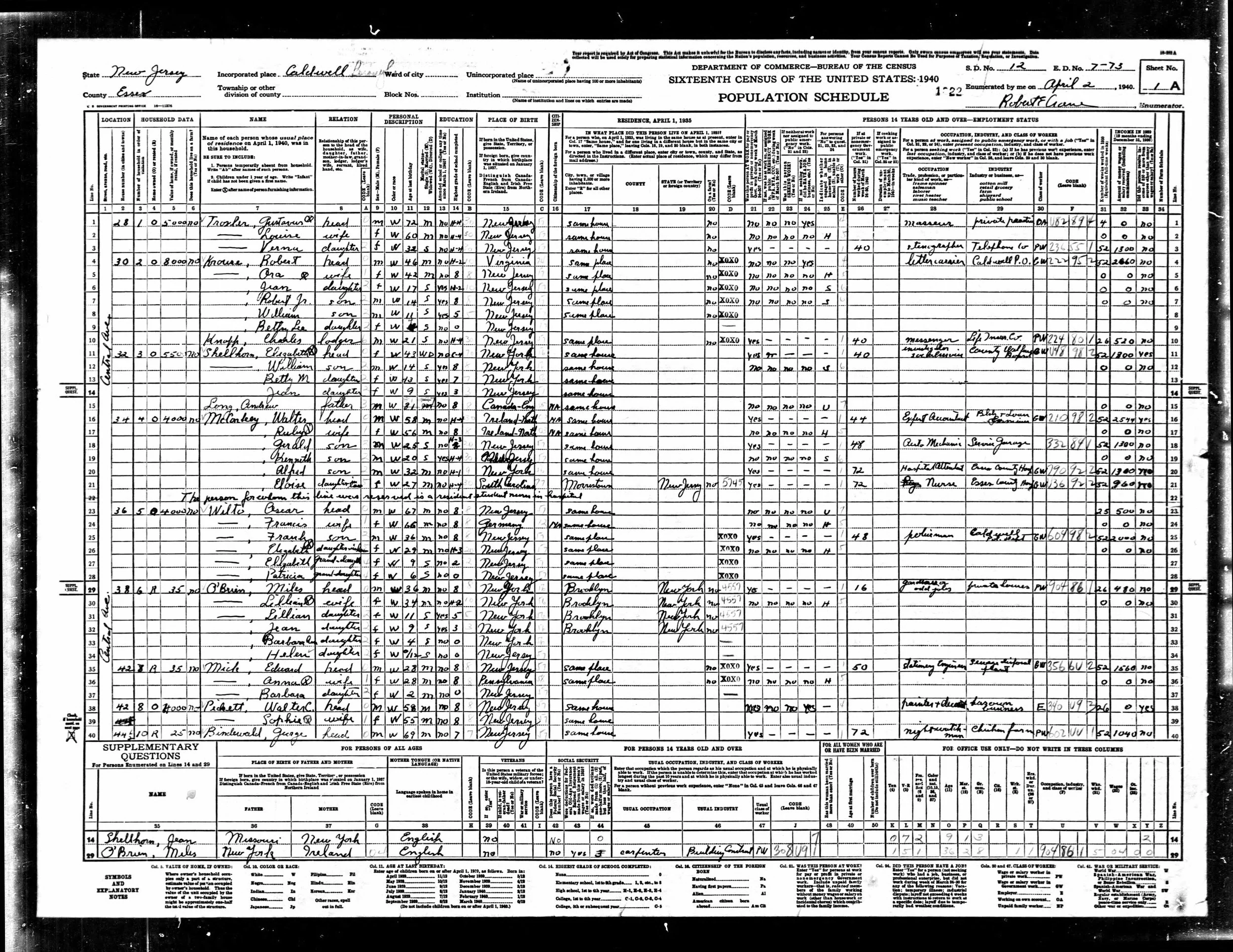 1940 United States Federal Census. Year: 1940; Census Place: Caldwell, Essex, New Jersey; Roll: m-t0627-02330; Page: 1A; Enumeration District: 7-73. Ancestry.com Operations, Inc., 2012.
