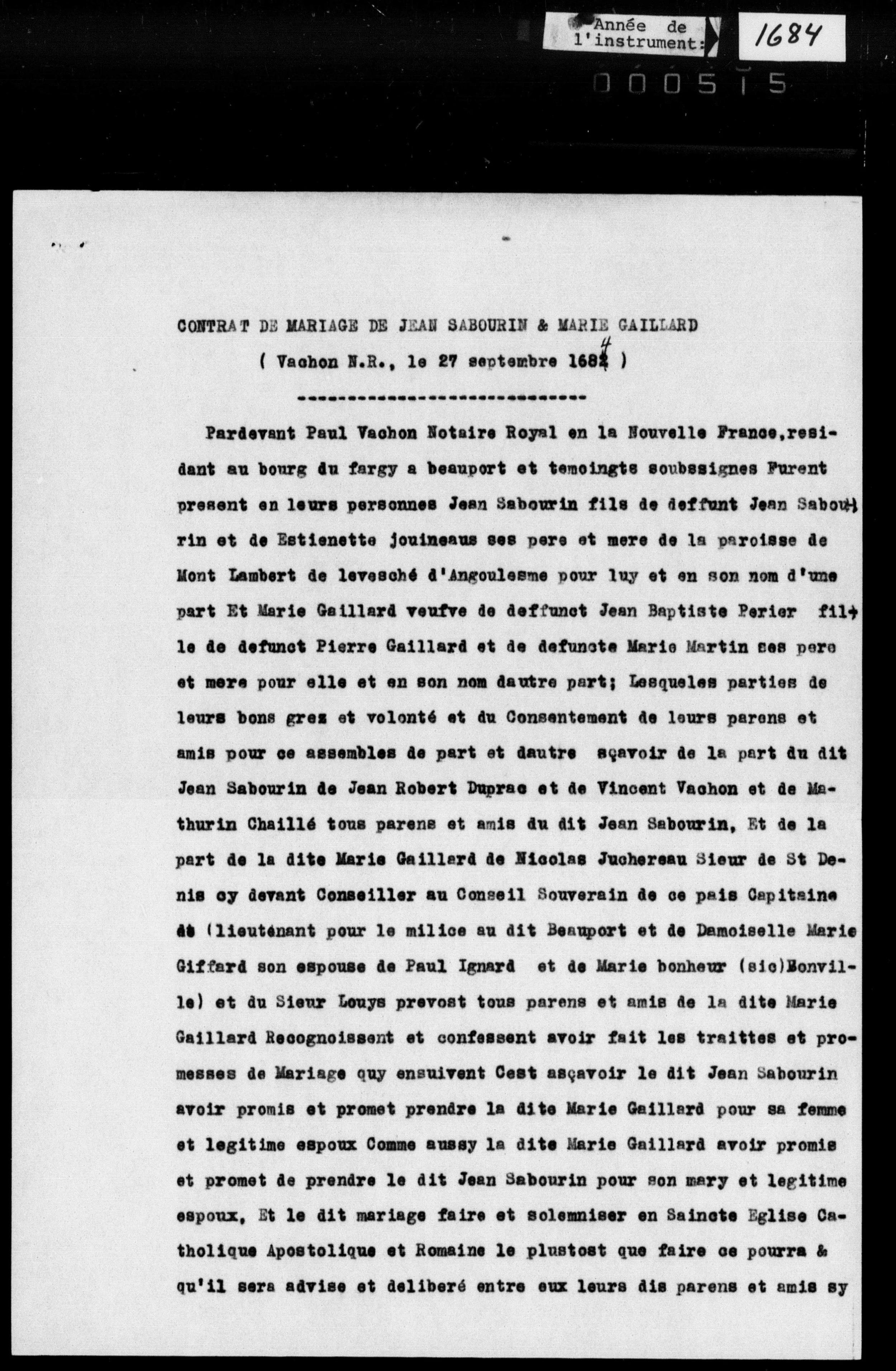 Marriage contract, Jean Sabourin and Marie Gaillard, 27 September 1684, notary Paul Vachon; Bibliothèque et Archives nationales du Québec.