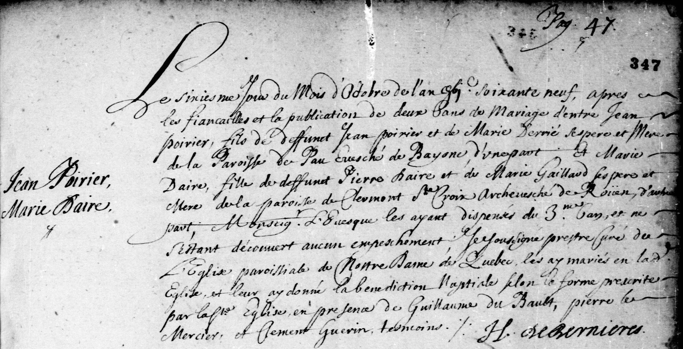 Programme de recherche en démographie historique (PRDH), Université de Montréal (https://www.prdh-igd.com : accessed 26 Jan 2026), couple no. 2848, Jean Perrier and Marie Gaillard; couple no. 4636, Pierre Daire and Marie Gaillard; couple no. 2849, Jean Poirier Perrier and Marie Dervie.