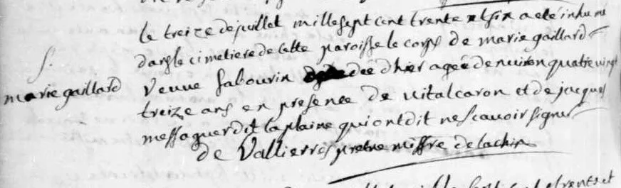 Marie Gaillard died on July 12, 1736. She was approximately 89 years old, though the priest who buried her the next day in the Saints-Anges cemetery in Lachine recorded her age as "about 93"—a common optimism in colonial records. She had outlived her first husband by 54 years, her second husband by 15. She had crossed an ocean, built and rebuilt households, merged families, and shaped a lineage.