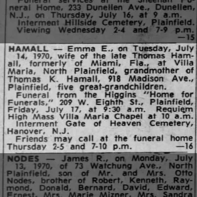 Emma E. Hamall died on July 14, 1970, at the age of 87. Her obituary in the Plainfield newspaper listed her as "wife of the late Thomas Hamall, formerly of Miami, Fla." She was buried at Gate of Heaven Cemetery in Hanover, New Jersey.