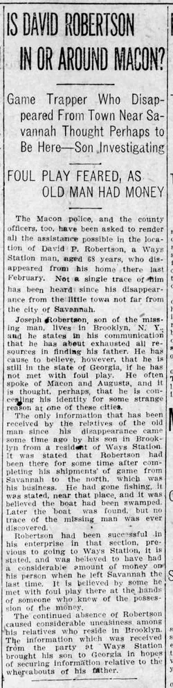 Joseph didn't simply file a missing person report and wait. He traveled from Brooklyn to Georgia—a significant journey in 1910—and conducted his own investigation across multiple counties. His search took him from the Savannah area to Macon, where he worked with local police and ultimately convinced The Macon Telegraph to publish a public appeal on October 1, 1910.
