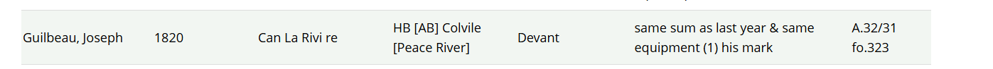 - HBCA, A.32/31, fo.323, HBC Servants' Contracts, Joseph Guilbeau, 1820; devant, Colvile House (Peace River); signed by mark; witnesses Charles Thomas, Baptiste Brunelle. Archives of Manitoba, Winnipeg.